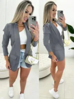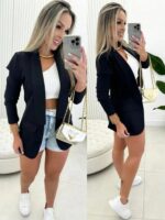 O Blazer Feminino Alfaiataria Wania é a escolha perfeita para quem busca sofisticação e estilo em uma peça moderna e elegante. Com modelagem slim fit, gola de xale e caimento assimétrico, ele valoriza a silhueta e oferece um visual refinado.