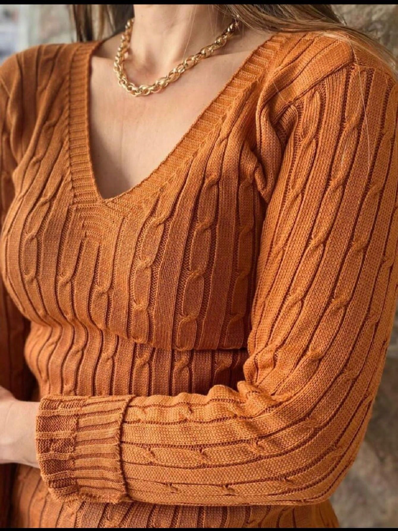 Confeccionada em tecido de malha com ponto em cabo, essa blusa apresenta gola V profunda que valoriza o colo com charme. Seu caimento regular garante conforto e ótimo ajuste ao corpo, ideal para temperaturas de primavera e outono. Combine com jeans, calças de alfaiataria ou saias para um visual cheio de personalidade.