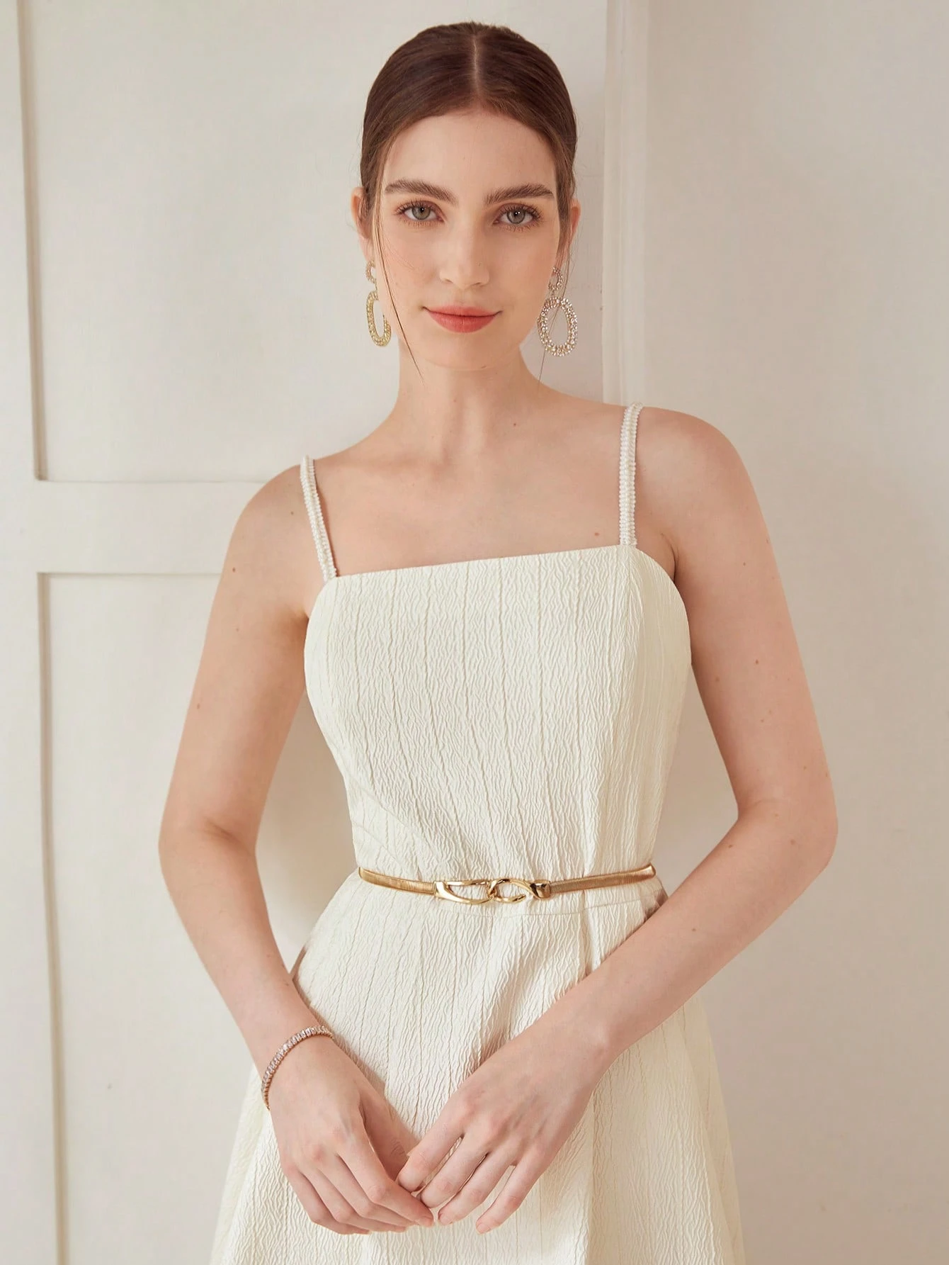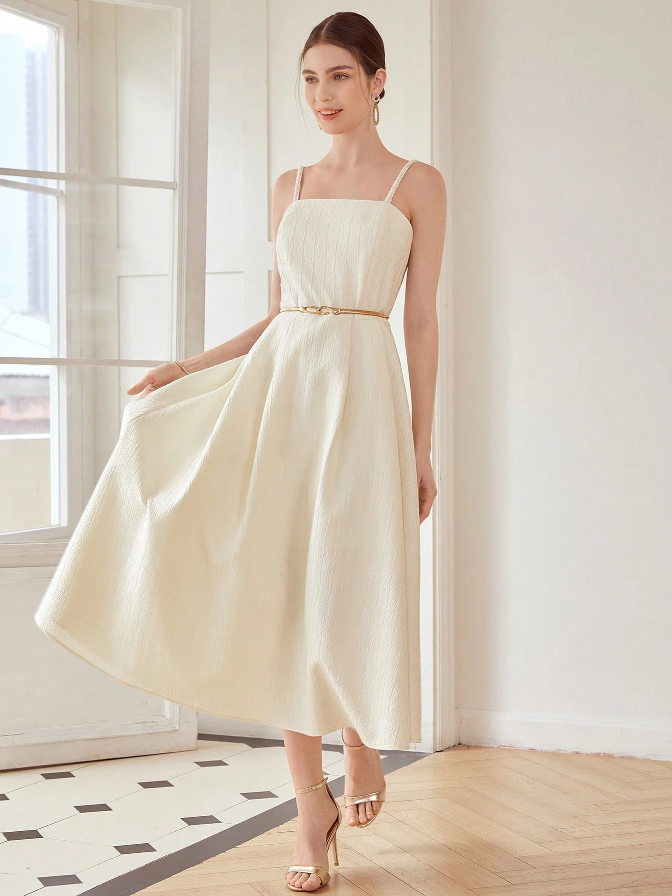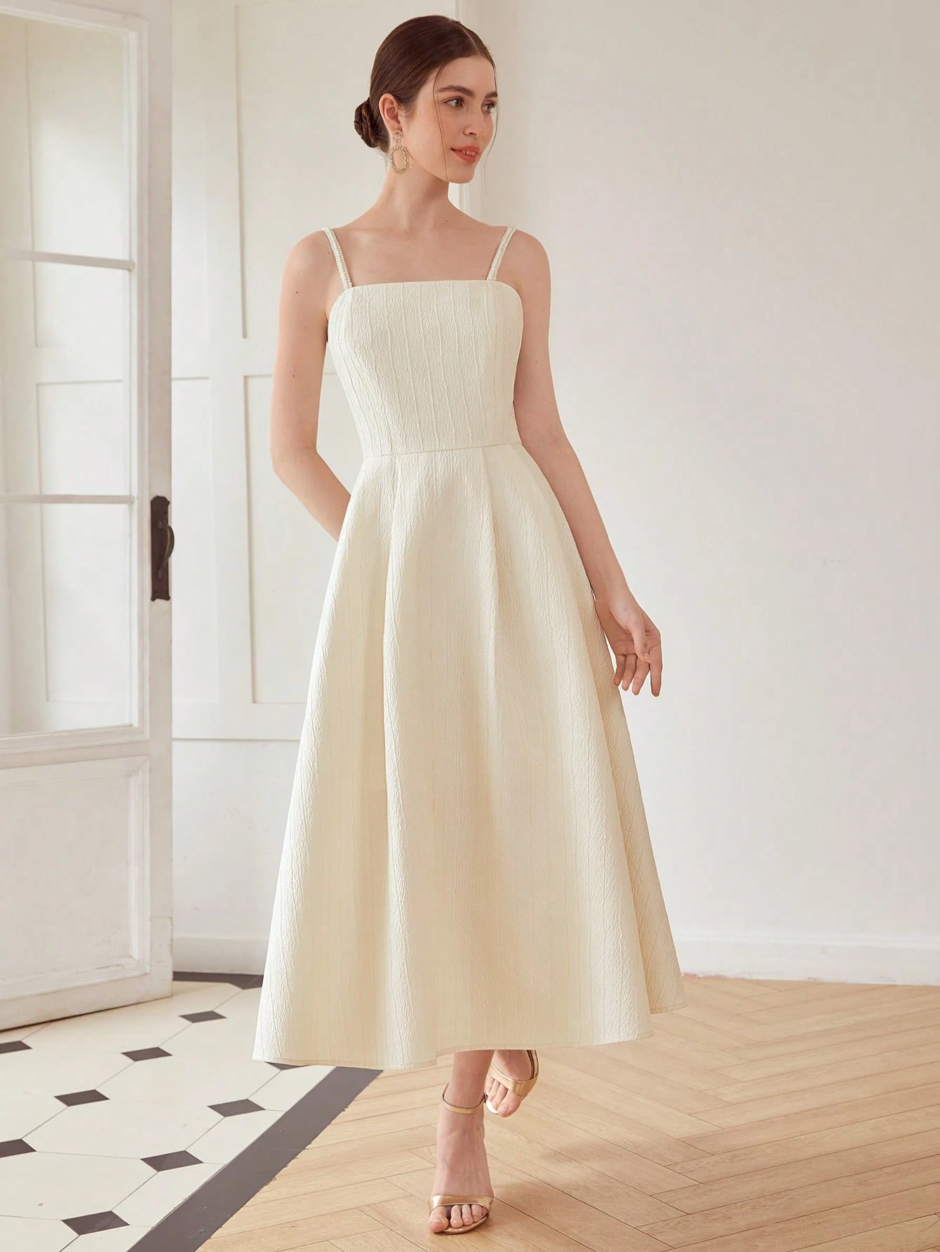 Vestido longo de festa em tom bege com alças finas estilo cami. Inspiração no minimalismo dos anos 90, com corte limpo e acabamento discreto que valoriza a elegância natural.