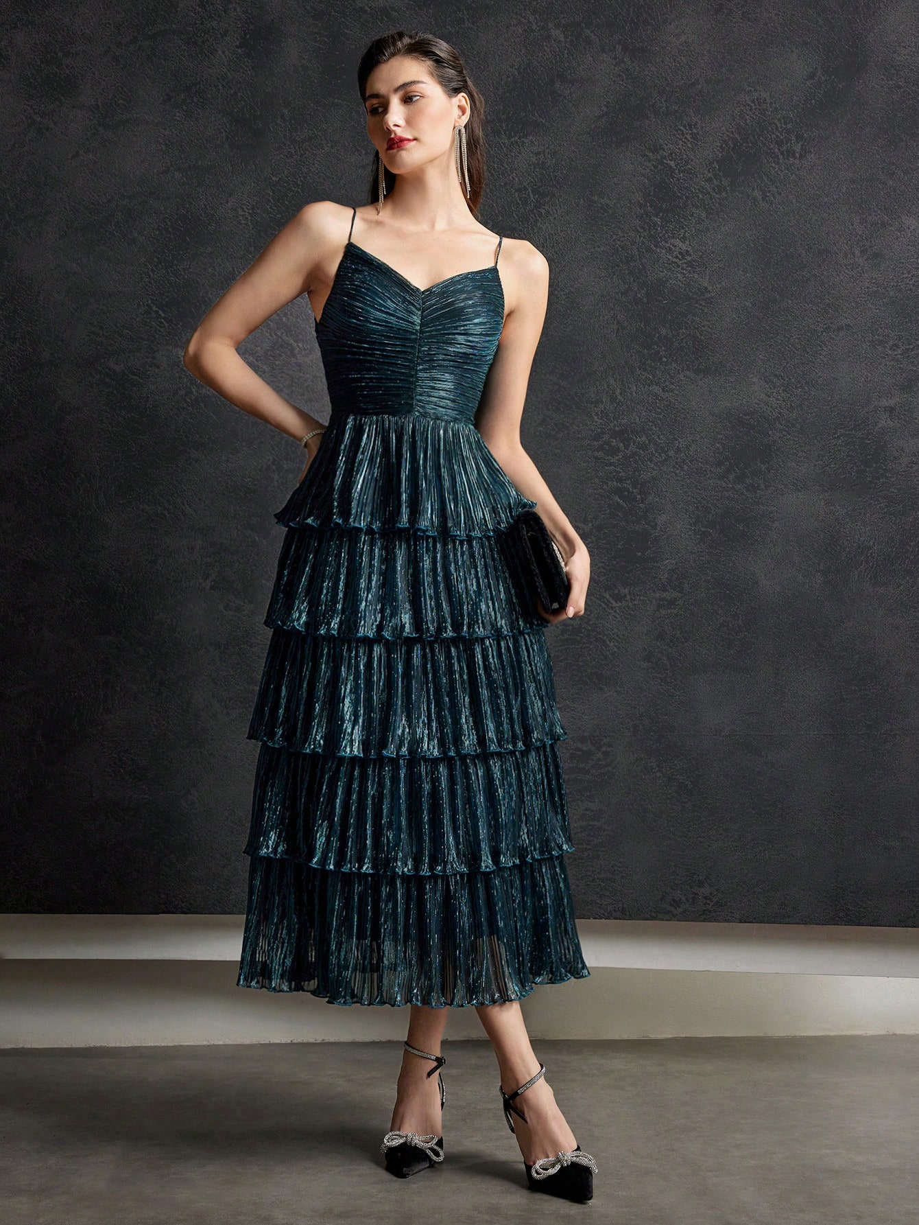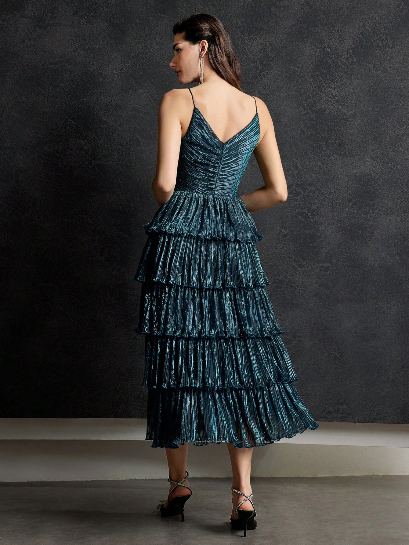 Vestido longo de festa com design em camadas que adiciona movimento e profundidade ao visual. Confeccionado com fibras metalizadas que criam um acabamento sofisticado e brilho discreto.