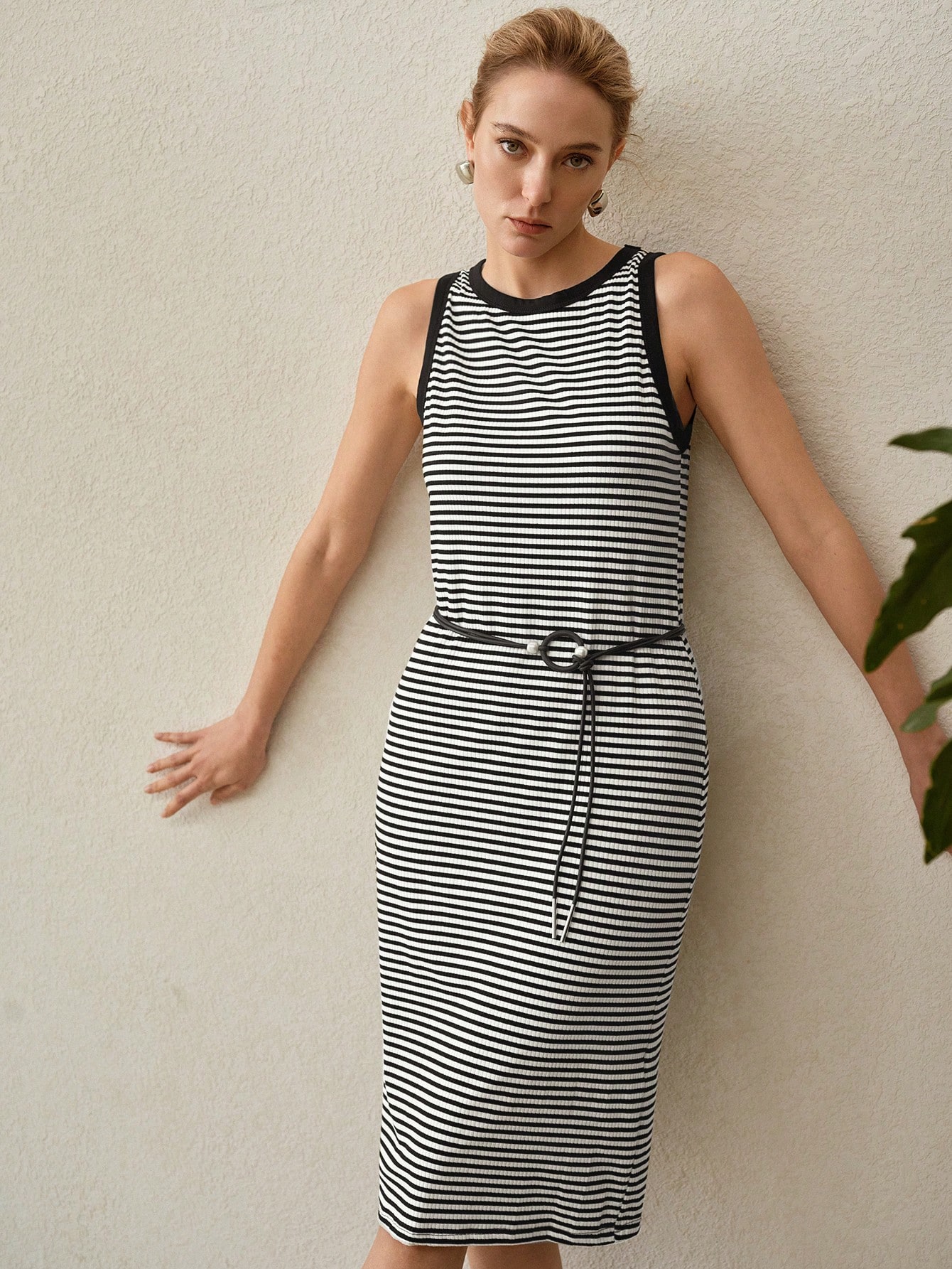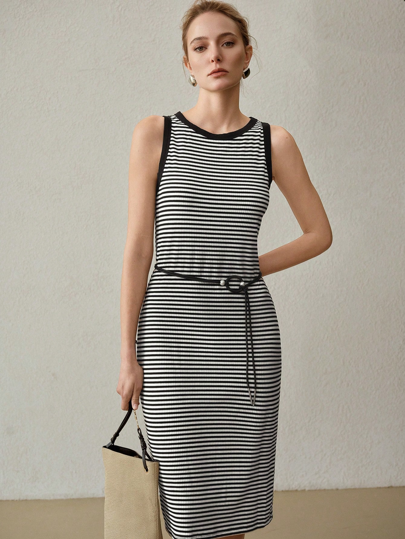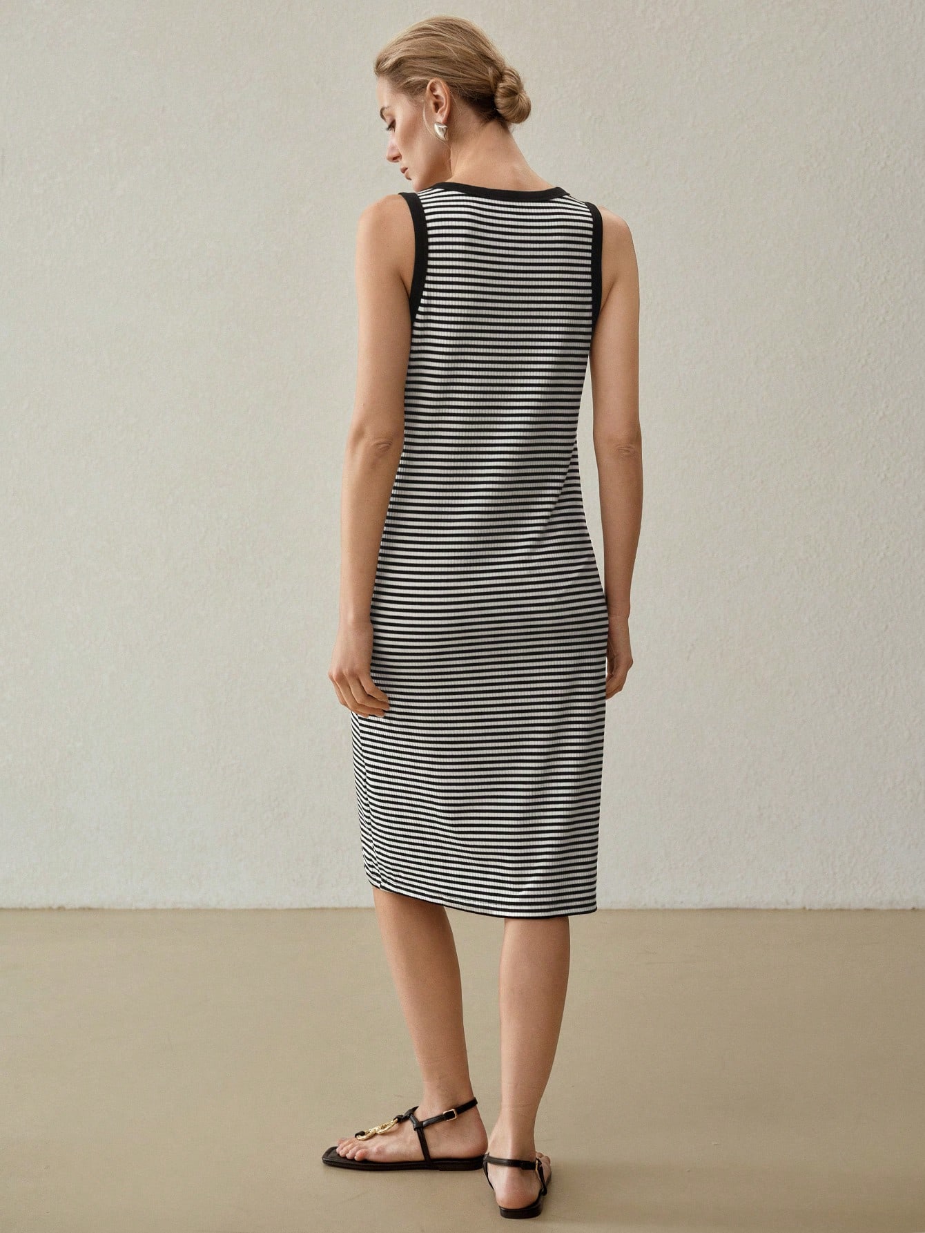 Vestido longo tricotado em malha com estampa listrada preto e branco. Silhueta alongada e acabamento discreto, pensado para um visual limpo e elegante no dia a dia.