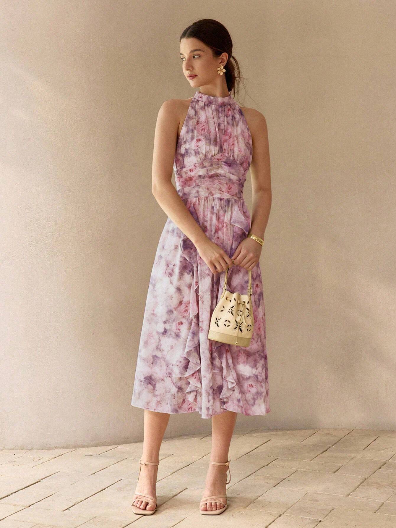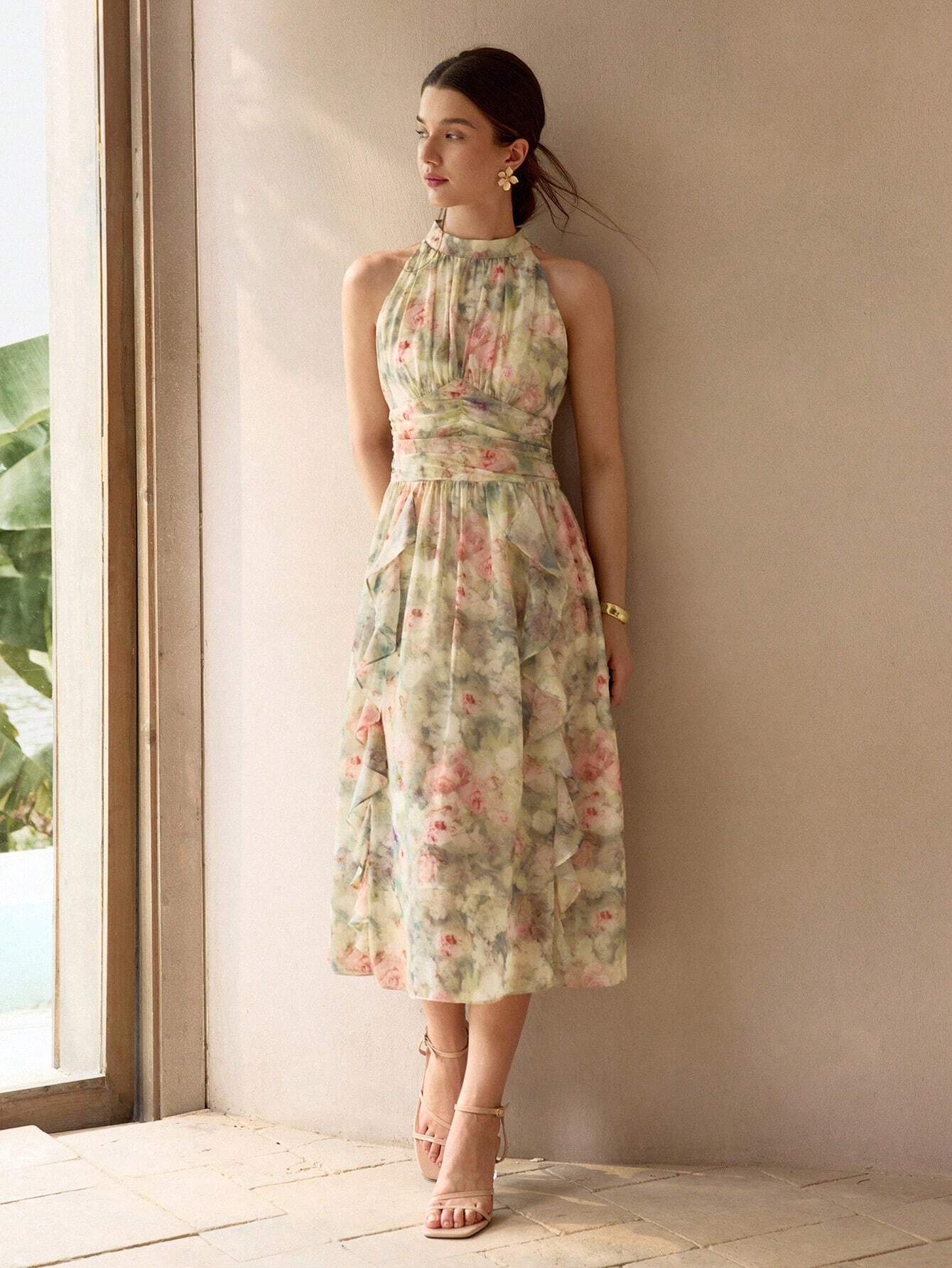 Vestido midi com estampa floral e detalhe de franzido na cintura que marca e valoriza a silhueta. Peça pensada para casamentos e eventos românticos.